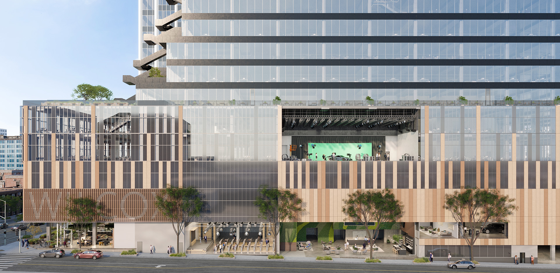 What do our tenants most need and want? What amenities would most elevate their game? Sunset & Wilcox was designed from the inside out for unparalleled efficiency and flexibility. In addition to multiple locations to accommodate double-height floor-to-ceiling clearances for sound stages, auditoria and screening rooms, the building can include a climate-controlled 22,000 SF Media Village that includes two fully functional stages, a car elevator, green rooms, post-production and editing bays, a digital recording studio, writers’ rooms and more. For maximum flexibility, our design team from Gensler is ready to work with tenants on early design input to customize spaces and experiences. This is Hollywood after all. We can stage anything.