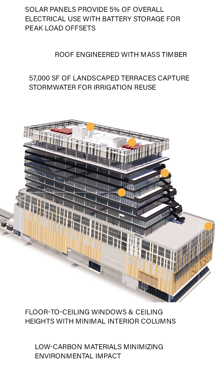To align and even exceed its tenants’ core sustainability values. Key features include: